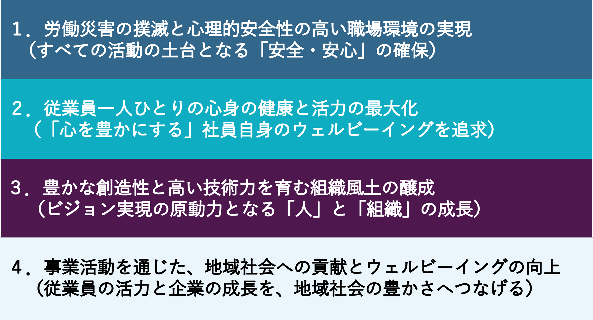 従業員が心身ともに満たされ、安全な環境で安心して働ける職場こそが、最高のパフォーマンスと創造性を引き出す基盤であると考えます。